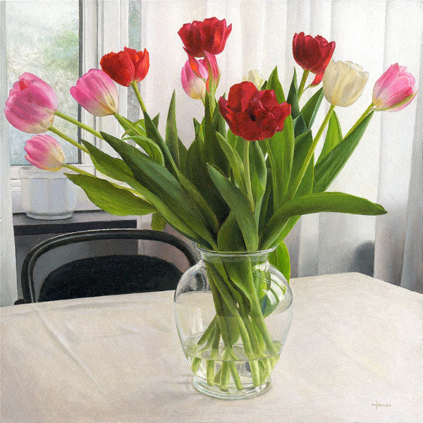 Detaljer i målningar har alltid fascinerat mig. Hur kan något se så verkligt ut när det egentligen bara är färg? Oljemåleriet är tekniskt sett svårhanterat. I gengäld skänker dessa pigment med linoljan, likt skimrande ädelstenar i olika skikt, ett inre ljus åt motivet. Trots fyrtio år av målande fortsätter nyfikenheten att levandegöra världen genom dessa material.